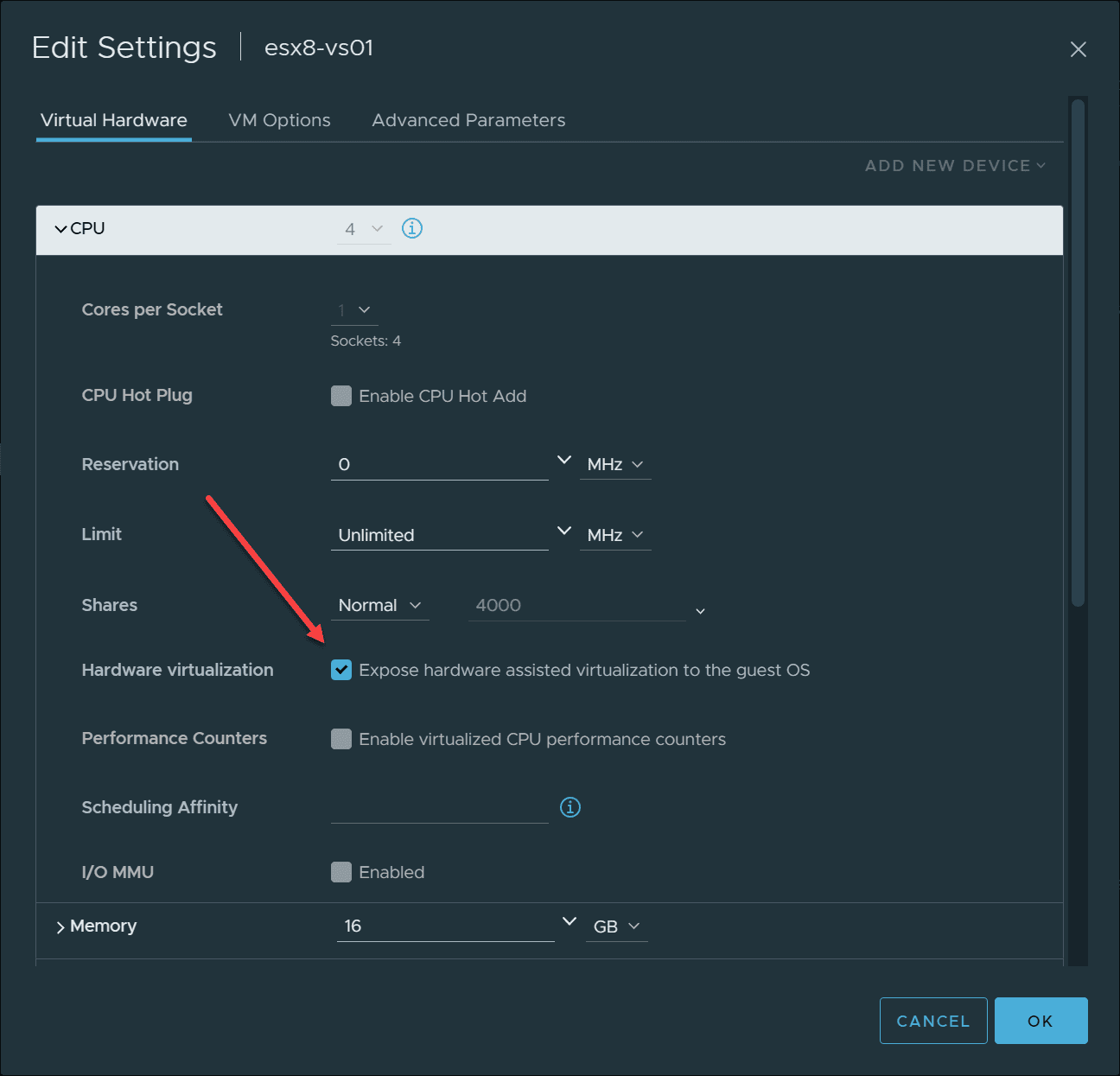 Enabling nested virtualization in VMware ESXi for a virtual machine is a simple checkbox.