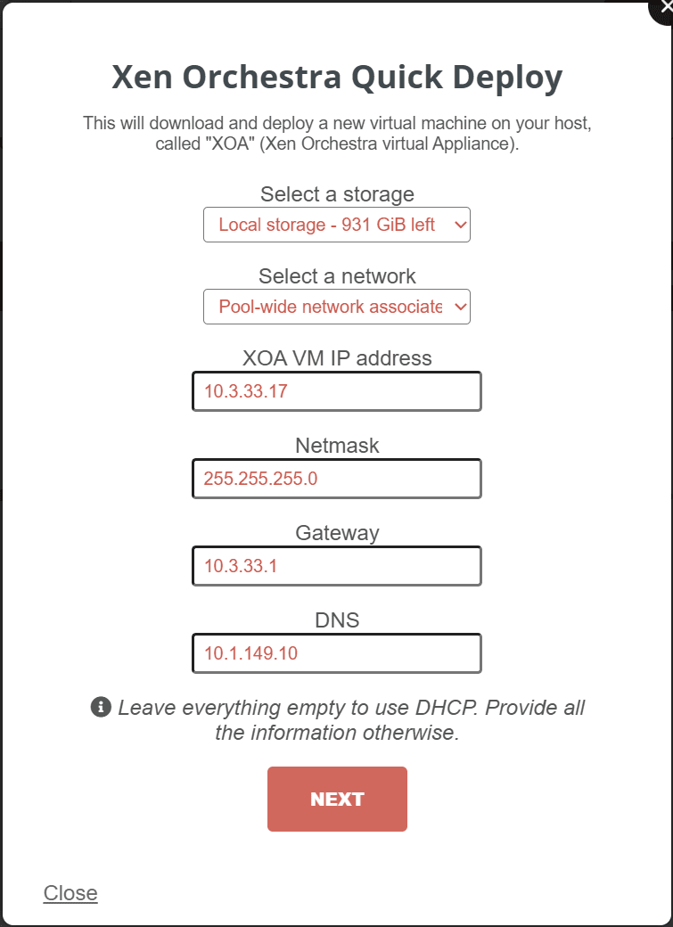 In the Quick Deploy dialog box, enter the storage, network, and assign the IP, subnet, gateway, and DNS settings.