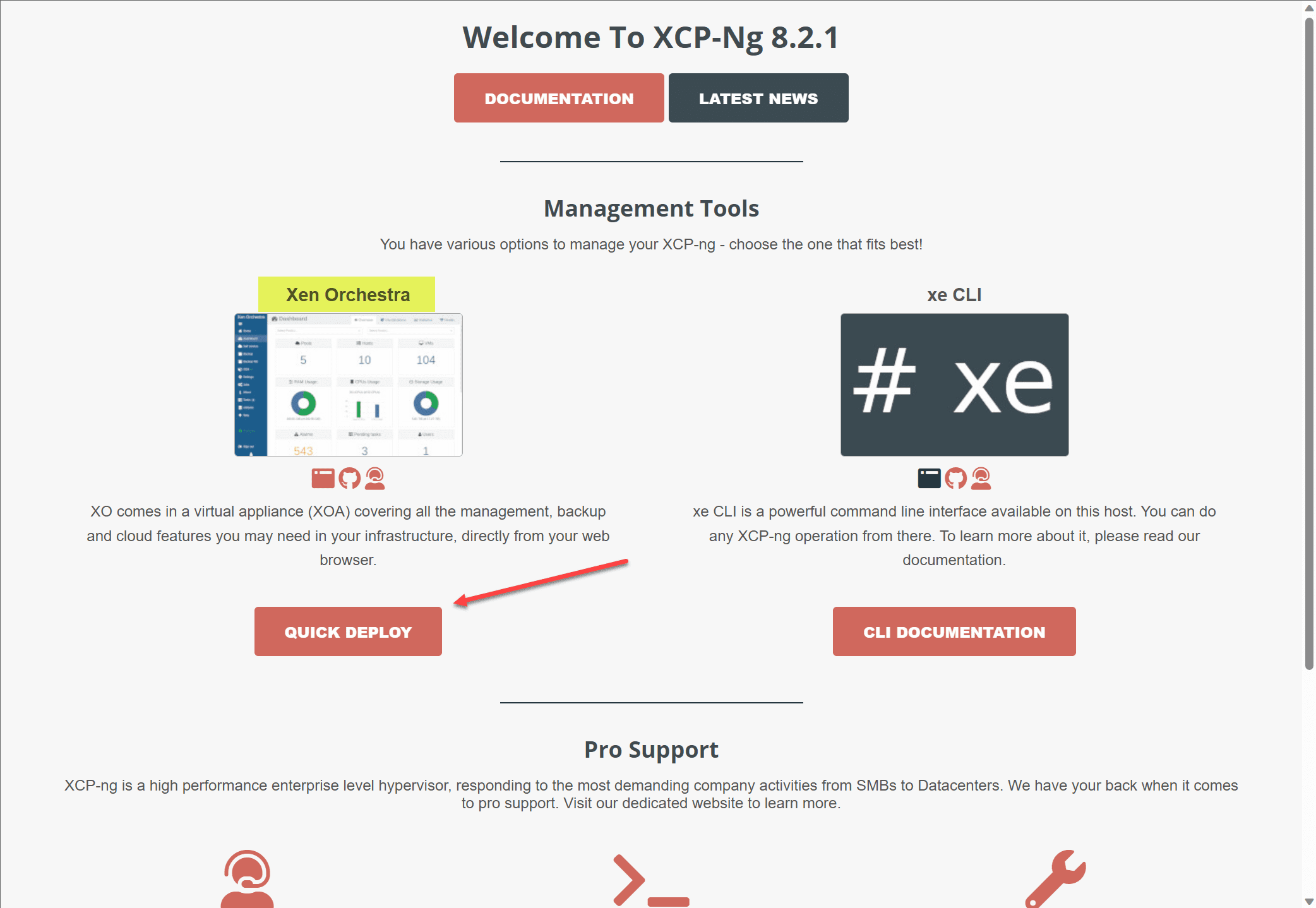 Let’s look at how to install XOA in XCP-NG. If you browse the hostname/IP of your XCP-ng host, you will see the option to Quick Deploy Xen Orchestra option.