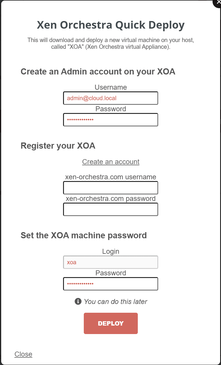Create an admin account on your XOA, register your XOA, and set the XOA machine password. Click Deploy.