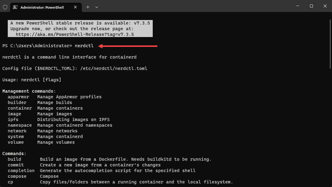 Working with container images is another aspect where nerdctl provides a really great tool. Nerdctl commands include things like the following to pull an image from a container registry: