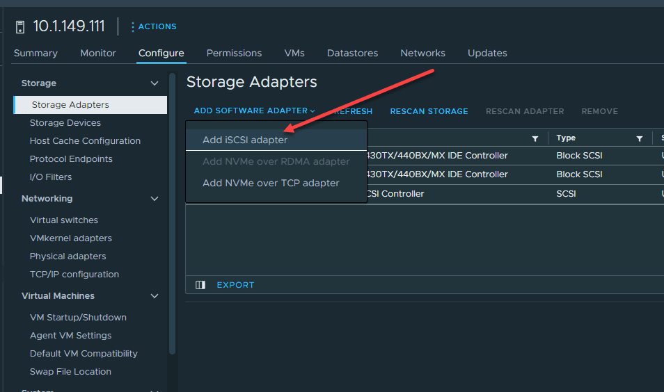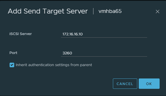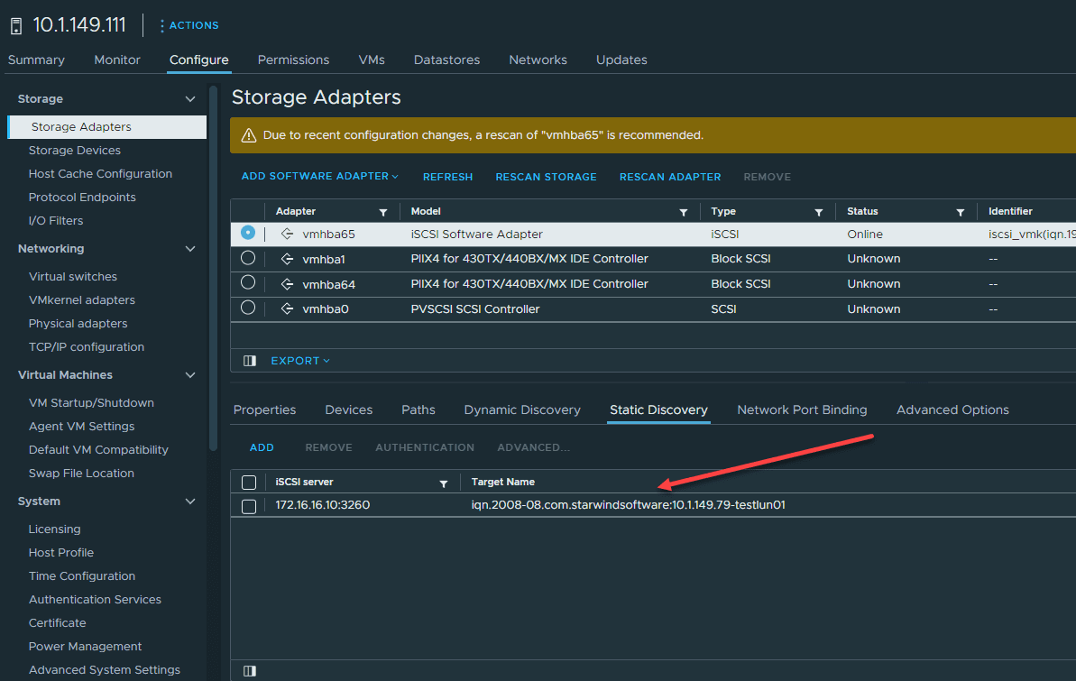 Under the storage configuration we add a new target server that matches the Data interface address of the StarWind appliance.