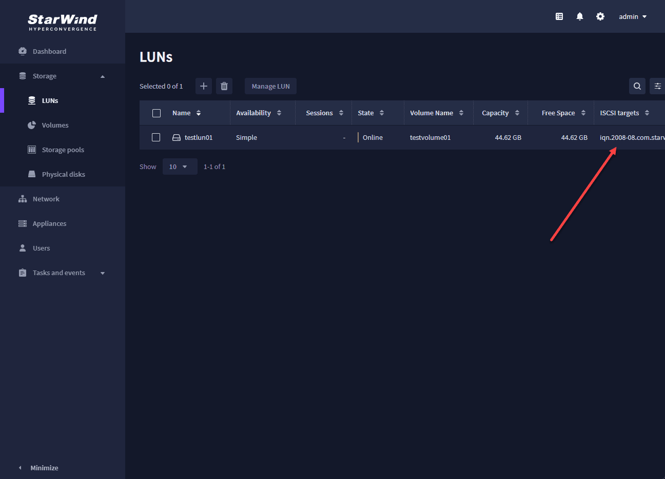 After you create a shared LUN, you will see the IQN address for use when configuring shared storage in the vSphere cluster.