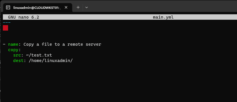 Below is my main.yml file that I am using for the Ansible playbook. As you can see, we are performing an Ansible copy file operation. I am copying a simple existing file test.txt file to a user’s home directory called linuxadmin. Here we define the absolute path source and destination.
