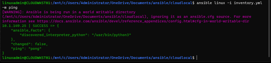 Once SSH connectivity is established after copying over the SSH key, we can use Ansible to test using a special ansible ping command.