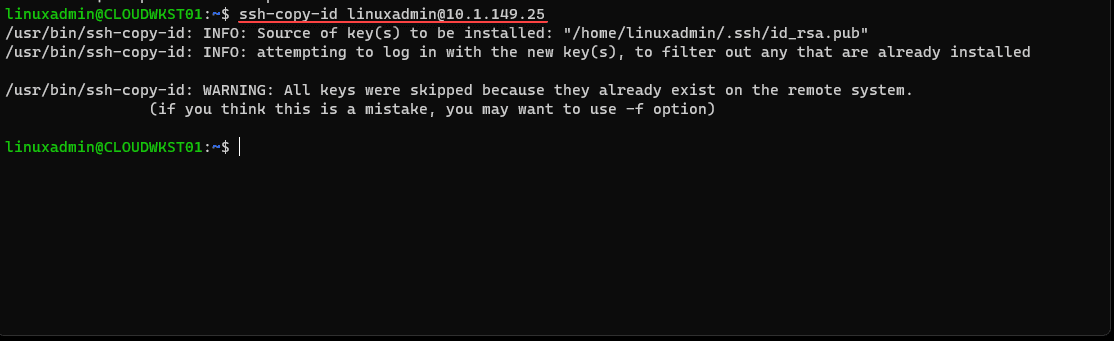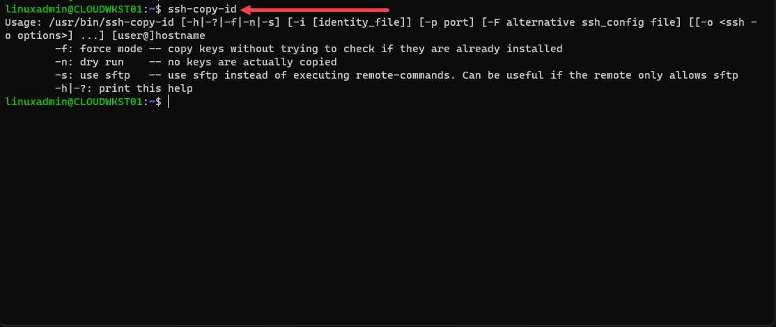 Here you will see the syntax of copying it to the remote host. You specify the remote user and server to which you want to copy over the key.