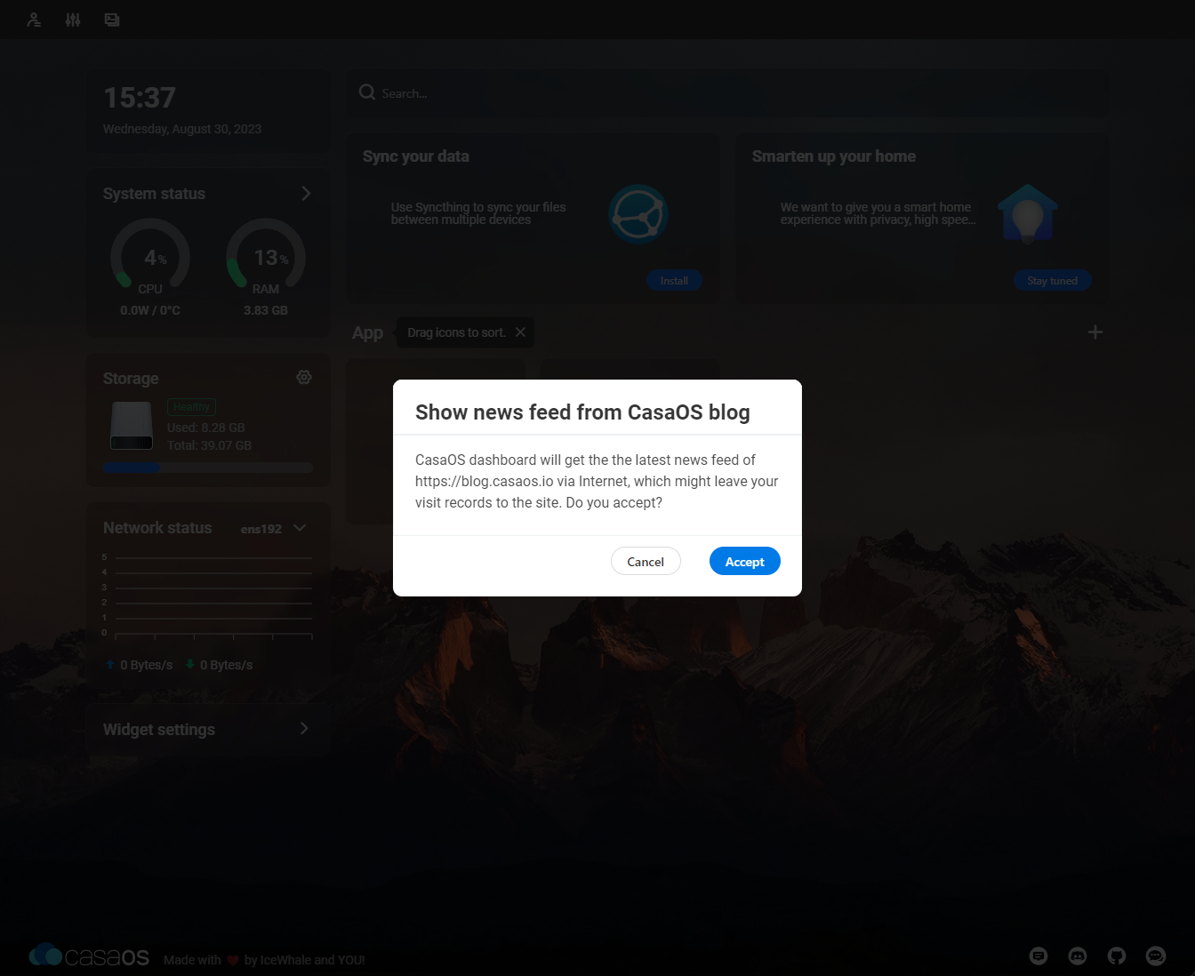 After we create the account, we can access the interface for the first time. You will see the prompt to show news from the CasaOS feed. You can opt in or out of this.