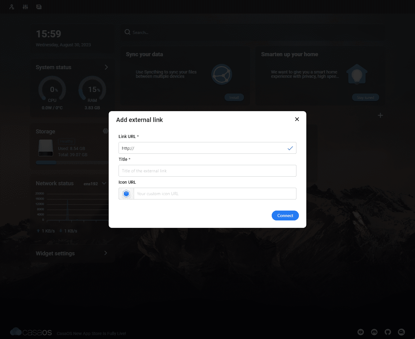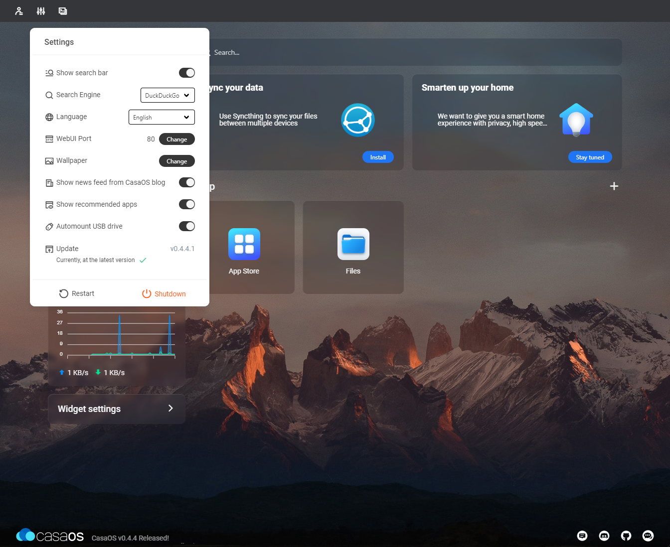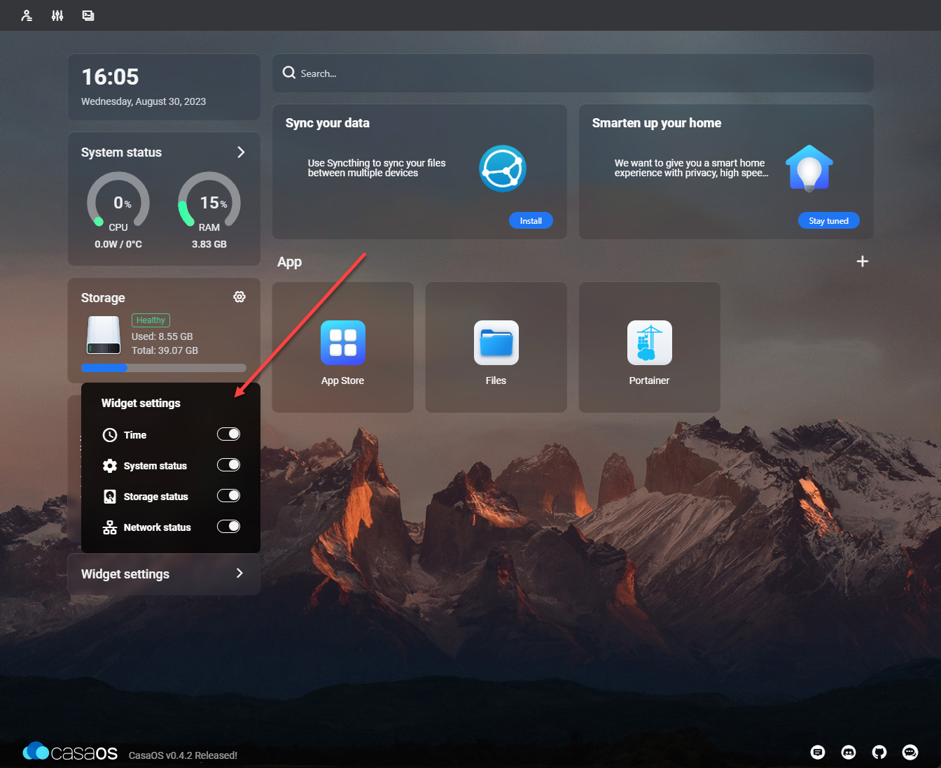 You can also customize your CasaOS dashboard and experience with the settings button in the upper left-hand corner. You can: