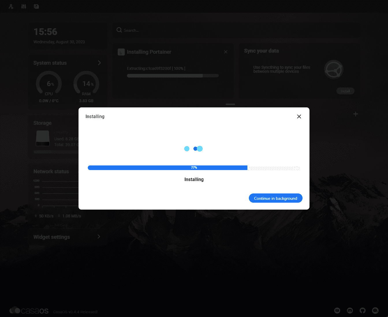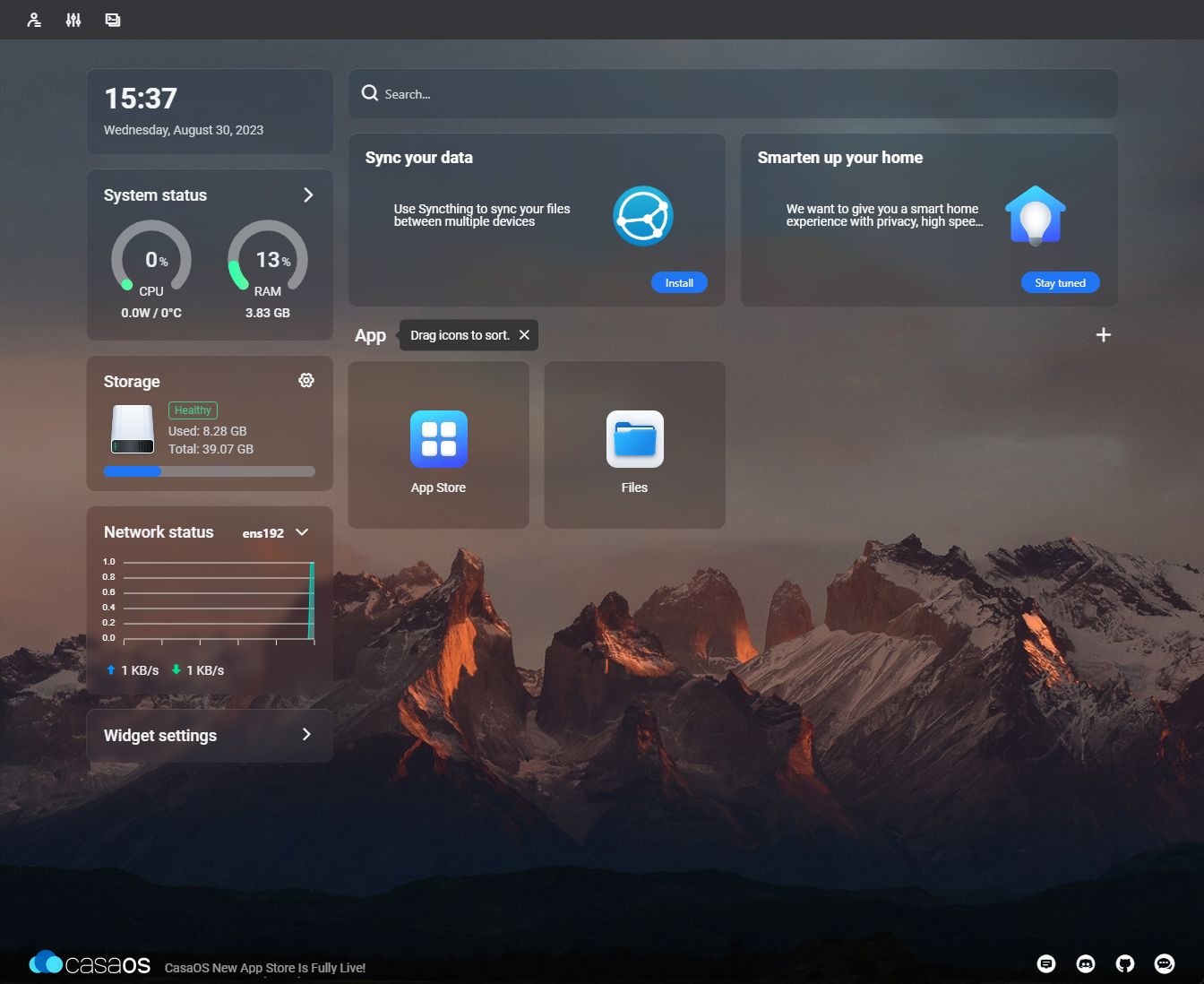 One thing I really like about CasaOS right from the start is how good it looks. Many dashboards you have to tweak and configure just to get to the point that CasaOS is at. It is beautiful. You get widgets for your system, and helpful directives to install certain apps like Syncthing, etc.