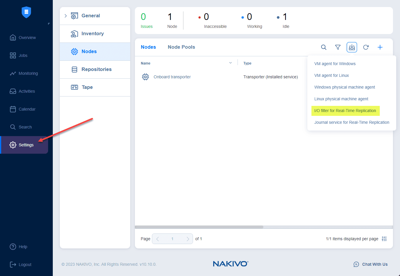 Under the Settings > Node area, you can download the I/O filter for Real-Time Replication.