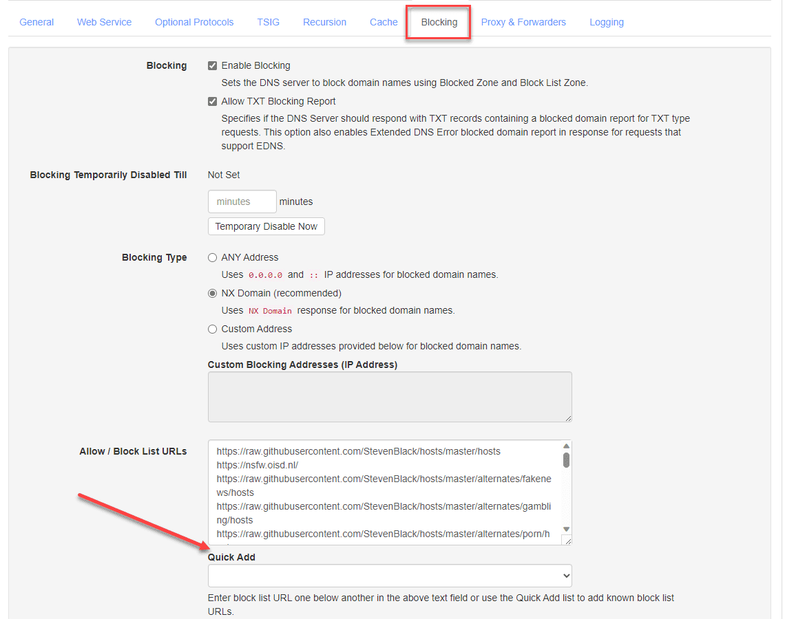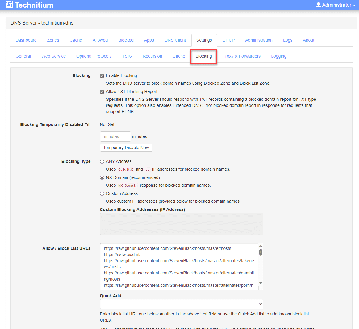 How do you add block lists to Technitium? They have made this quite easy, but it isn’t just readily obvious if you haven’t used Technitium before. Navigate to the Settings > Blocking page.