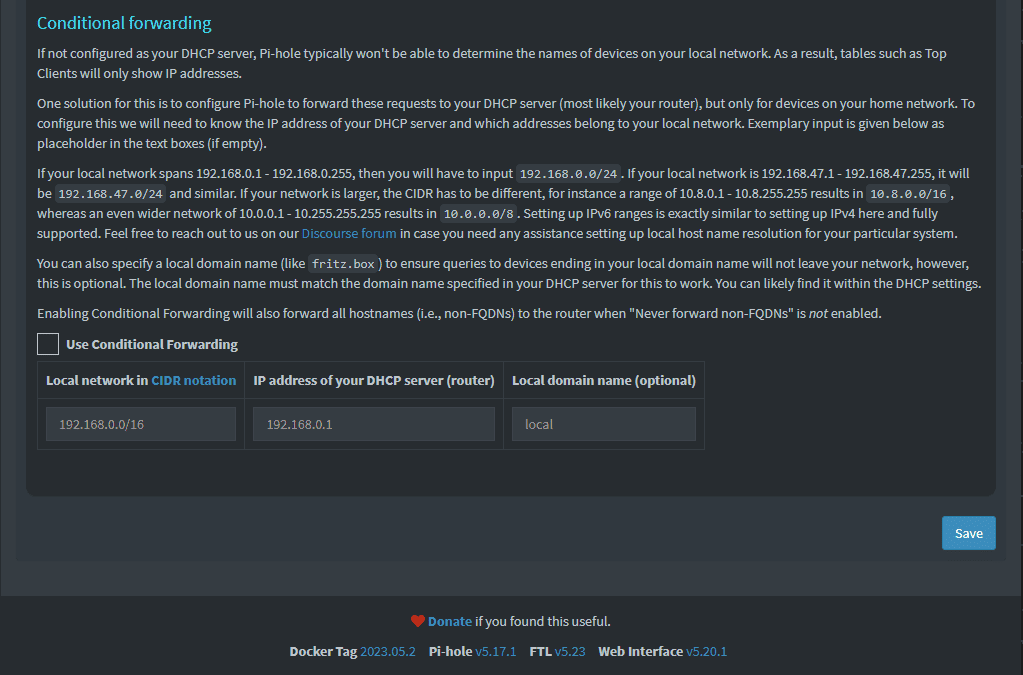 Below is a look at the Pi-Hole dashboard and conditional forwarder settings.