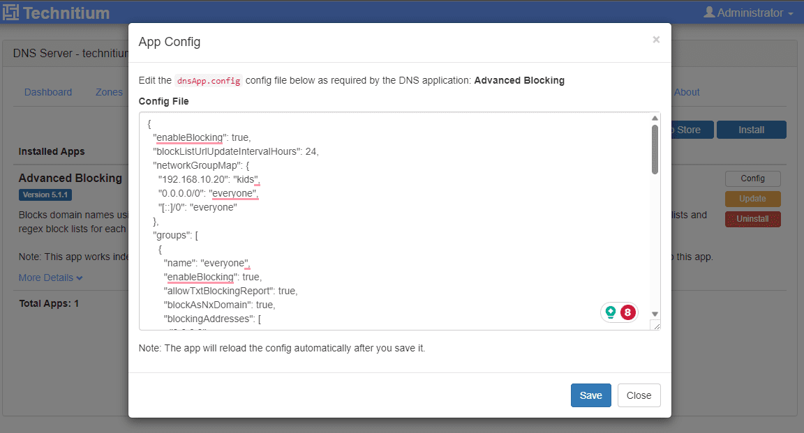 Below, I am editing the App Config for the Advanced Blocking DNS app.