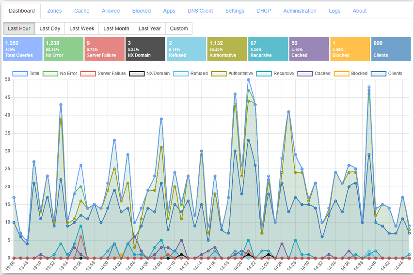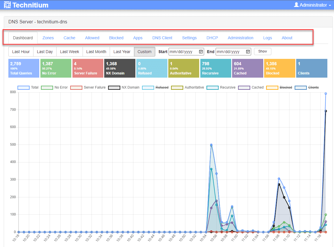 After a few moments (you may need to refresh the Dashboard screen), you will see the DNS query activity hit the Technitium DNS server.