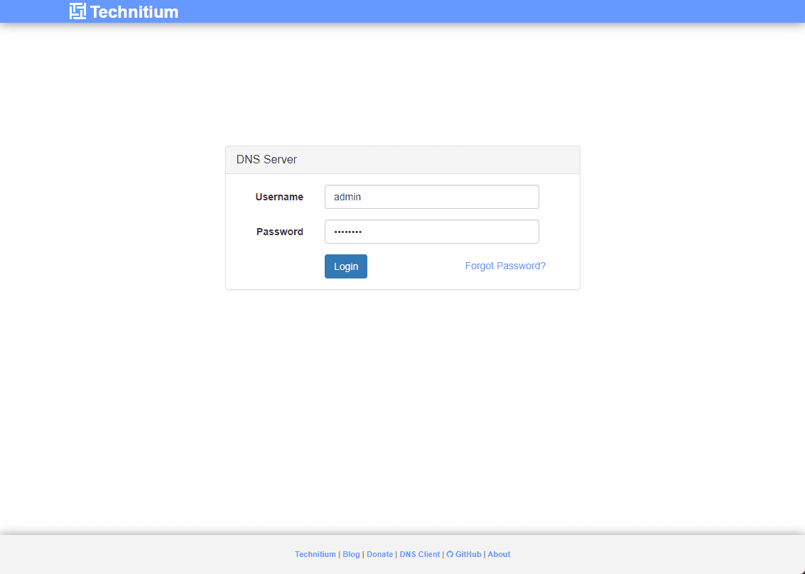At this point, you should be able to browse to the IP address of your Docker host, hosting the Technitium server and enter the credentials configured in the Docker Compose code.