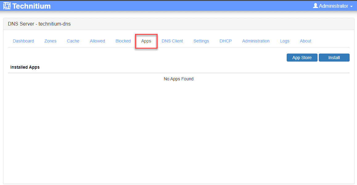 One of the great things about Technitium is its modular architecture. Within the Technitium interface, you can add DNS “apps” that extend the functionality of Technitium. You can access this from the Apps screen.