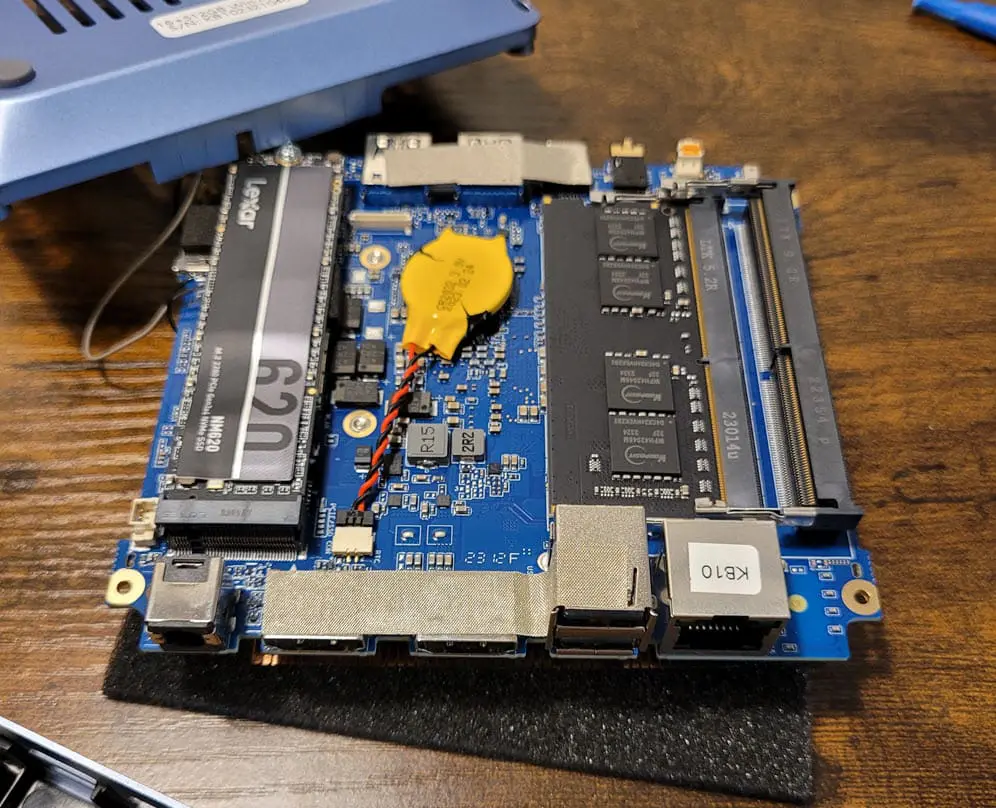 One of the things I don’t like about the GMKtek K10 is the top cover is difficult to get off. Unlike the Beelink devices with the built-in pull tab, the GMKtek K10 is more difficult to remove. You have to remove the back screws and pull off the cover which is “stuck” fairly tight. After that, you remove the screws holding the motherboard into the other side of the case. After that, you will have the freedom to see the other side of the unit which houses the 2280 NVMe drive and the (2) DDR-4 memory slots.
