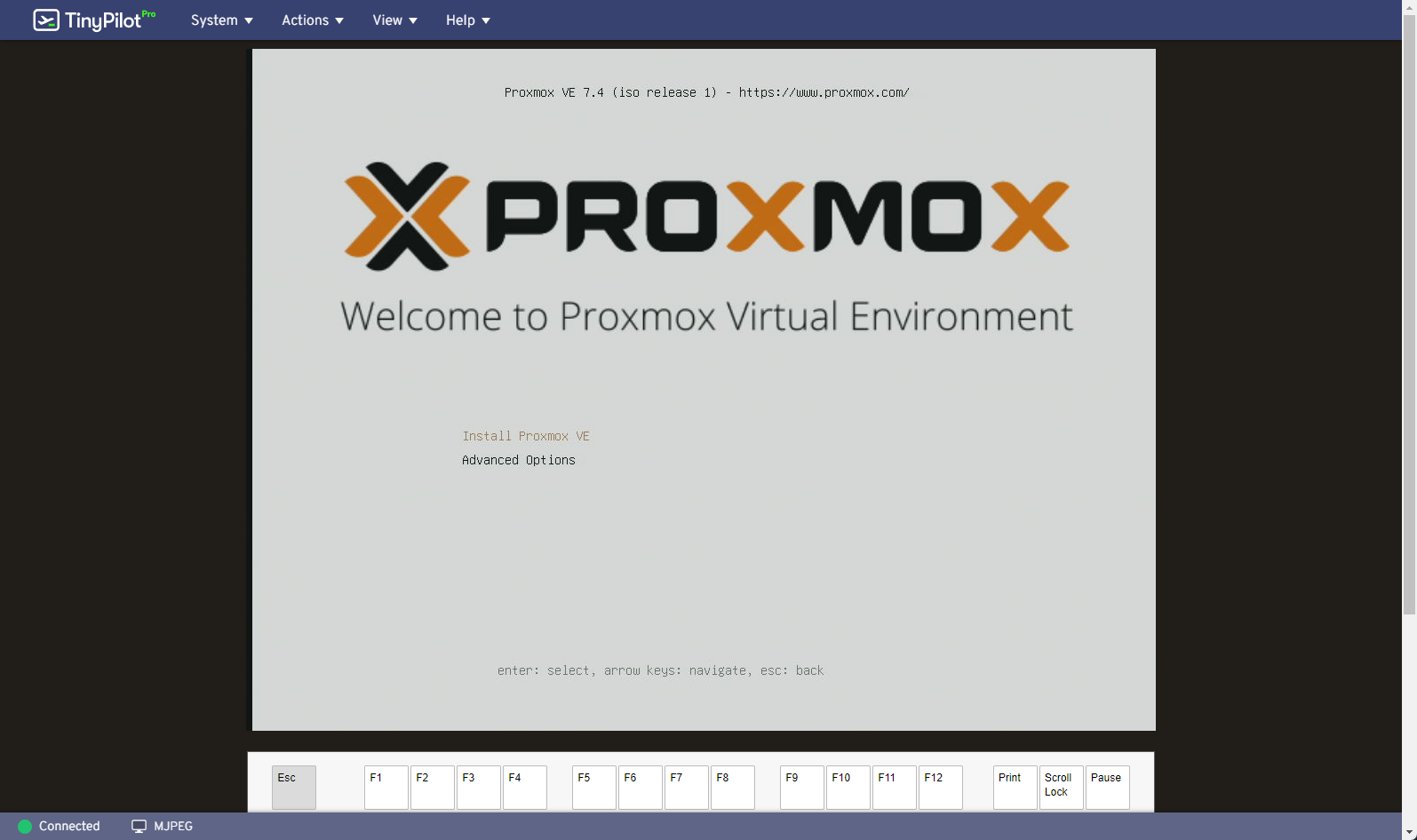 Below is a TinyPilot connection to the console of a mini PC running Proxmox.