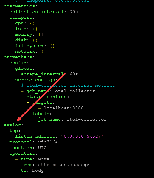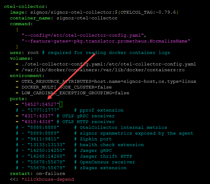 First, I added a port listener in the docker-compose.yaml file for the otel-collector container. This port is the port that will listen for syslog traffic. I have also tested this with the standard syslogs ports of 514 and 1514. However, below, I was just following the example provided by SigNoz. You can change this port to what you would like.