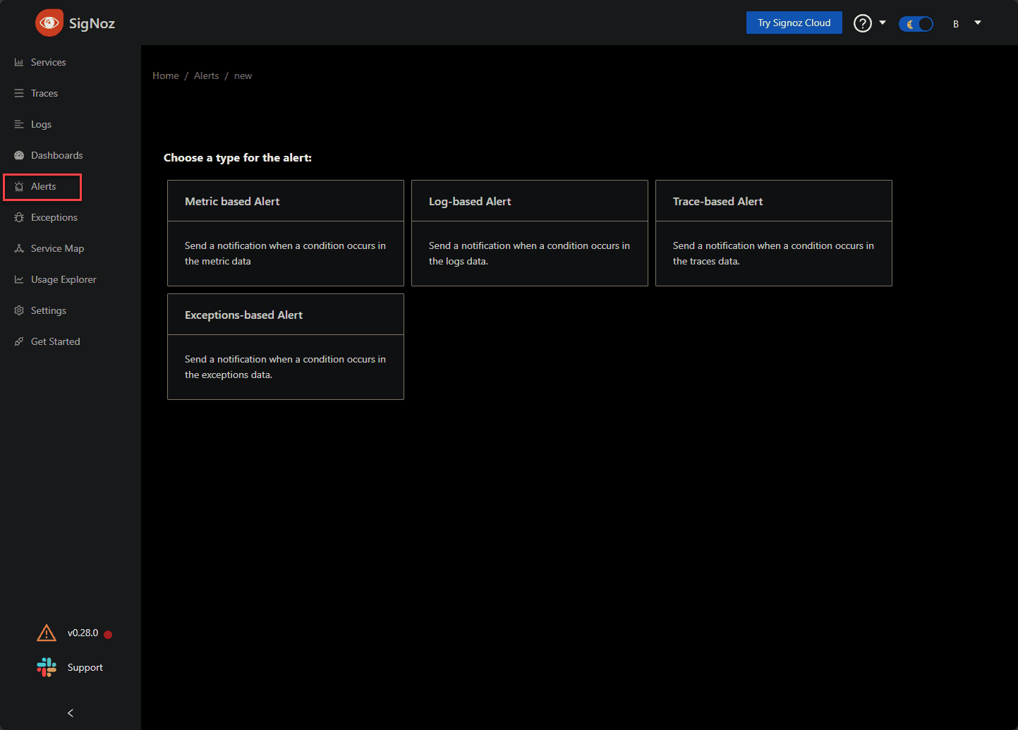 Another small feature but extremely important is you can set alerts in the SigNoz solution. Click alerts to view the alert options.