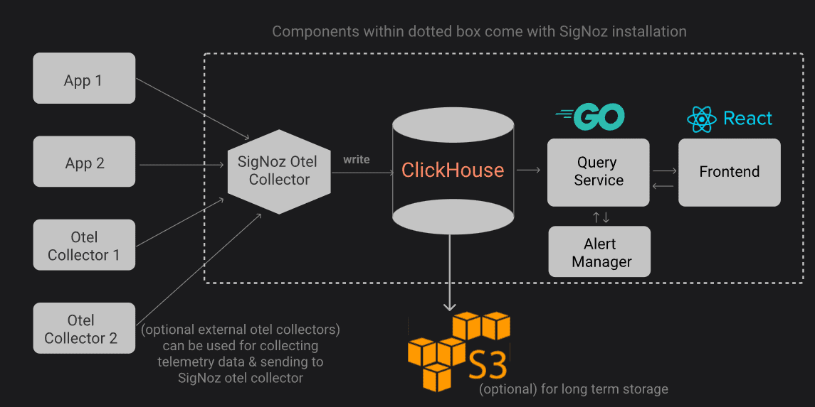 SigNoz’s architecture includes components like the OpenTelemetry Collector, which harvests telemetry data, and ClickHouse, a high-performance database management system.