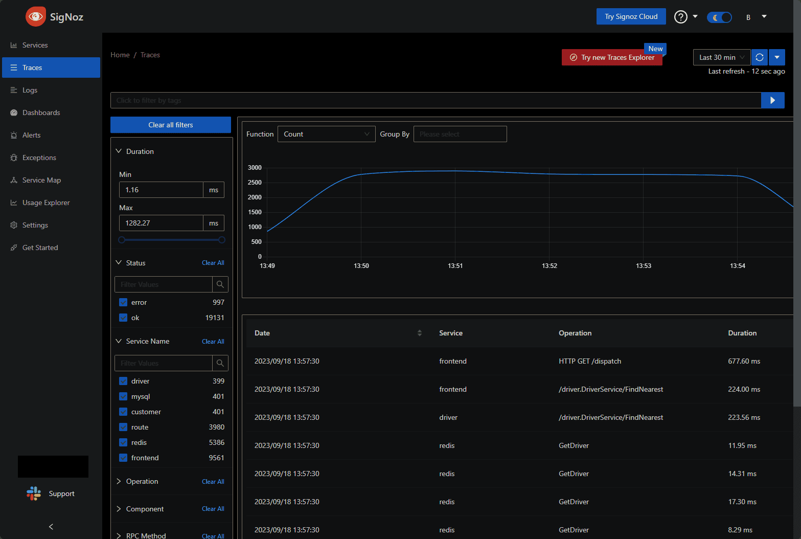 For development or if you are looking for an open-source Datadog or New Relic, SigNoz is an excellent option. It offers many features to monitor, analyze, and improve application performance. It is also easier to spin up than a solution like Promtail, Grafana, and Loki.