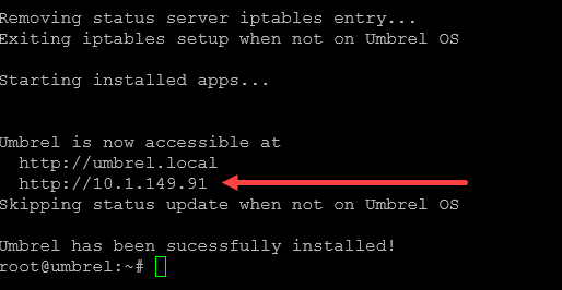 At the end of the installation, you will see how to get to your Umbrel Home OS URL.