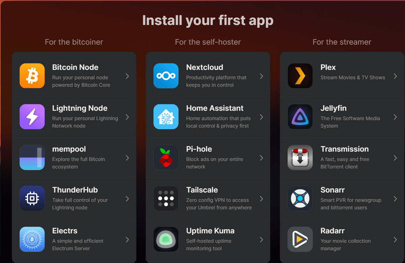 Finally, we are taken to the app installation screen. Here Umbrel divides up the apps by use case. We see the following: