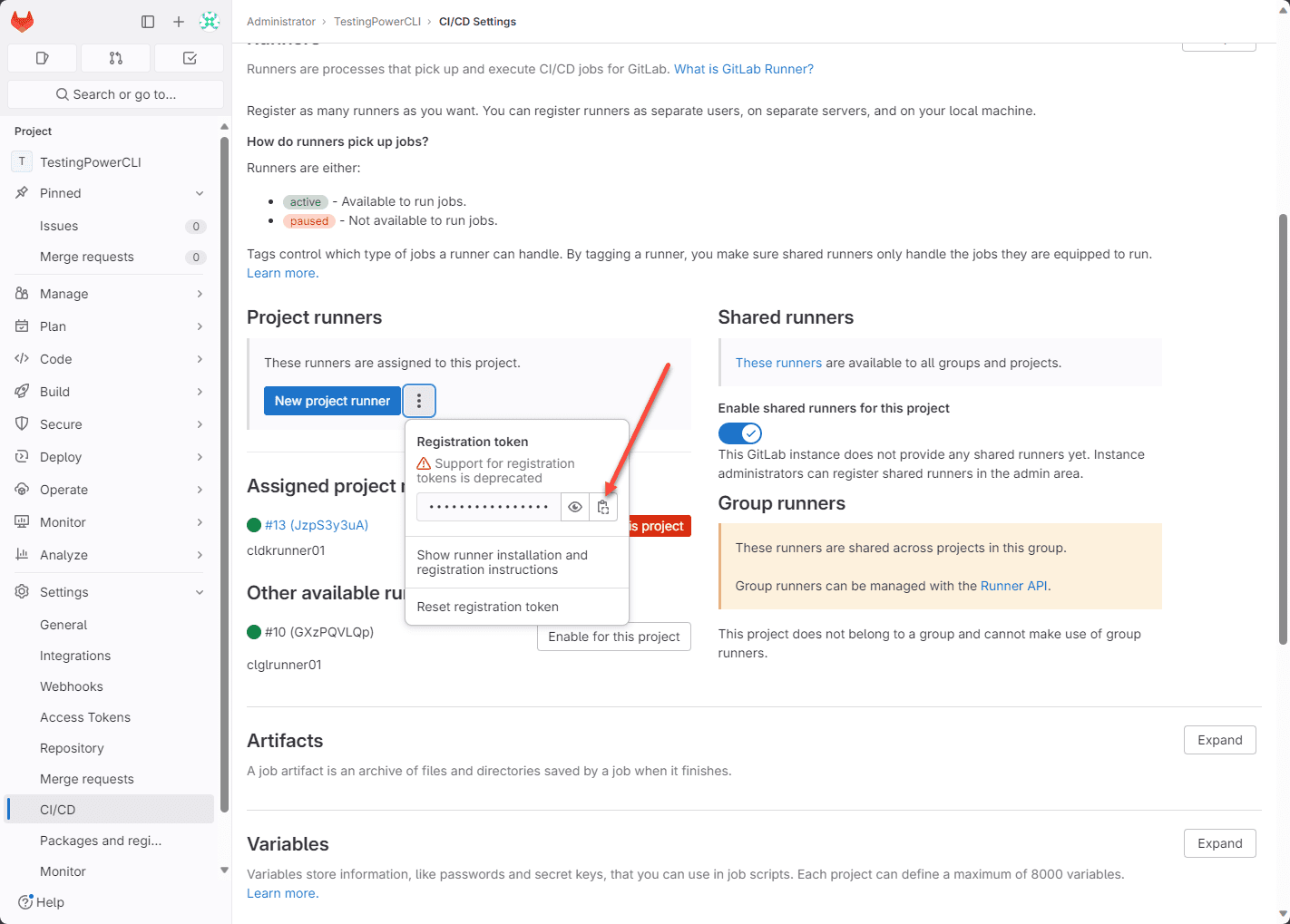 Here you can click the ellipse next to New project runner, and then click the copy icon that appears to copy your token. You will use this to add the Gitlab runner to the project.