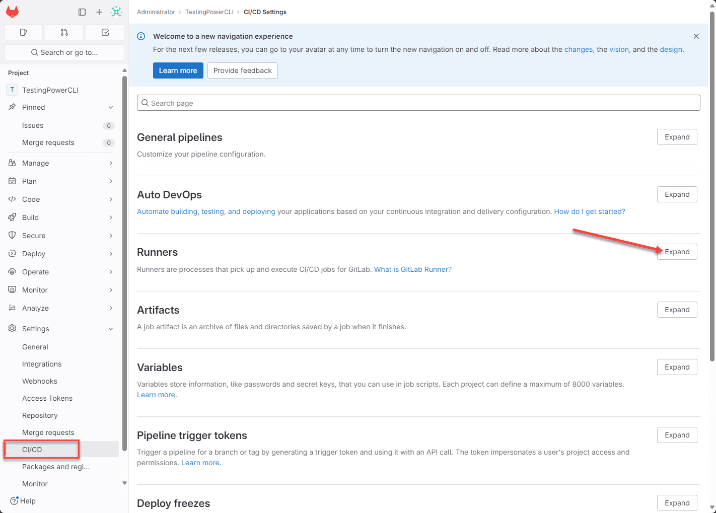 You need to go through a process to connect your GitLab runner to your GitLab CI CD pipeline. Once you have your Gitlab and Gitlab runner stood up, you can create a project in Gitlab. After you have a project (we will show how to create one in the section below), go to the Project Settings > Runners > Expand.