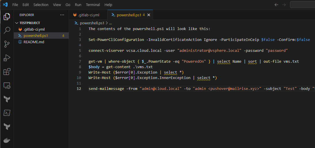 So, for a quick example, let’s build a pipeline that will use a PowerCLI container to run a simple PowerCLI script against a home lab vCenter Server. We will create two files in VS Code: