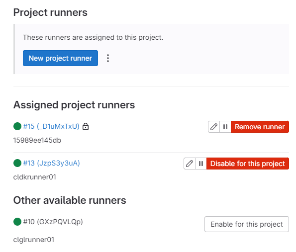 If you refresh your CI CD settings page for the Runners configuration, you will see your new GitLab runner assigned and it should show as “green”.