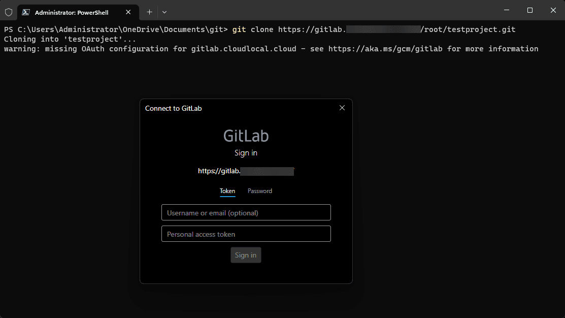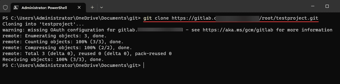 Now from the command line, you can use the git clone command to clone down your repository. Enter your credentials and authenticate to your GitLab instance.