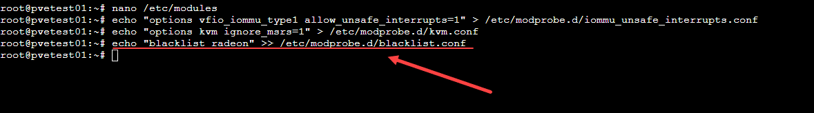 echo "blacklist nouveau" >> /etc/modprobe.d/blacklist.conf echo "blacklist nvidia" >> /etc/modprobe.d/blacklist.conf echo "blacklist radeon" >> /etc/modprobe.d/blacklist.conf