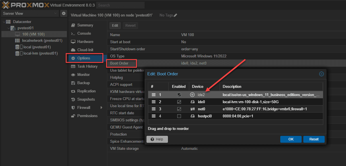 Set the boot order for your virtual machine to boot from an uploaded ISO image file.