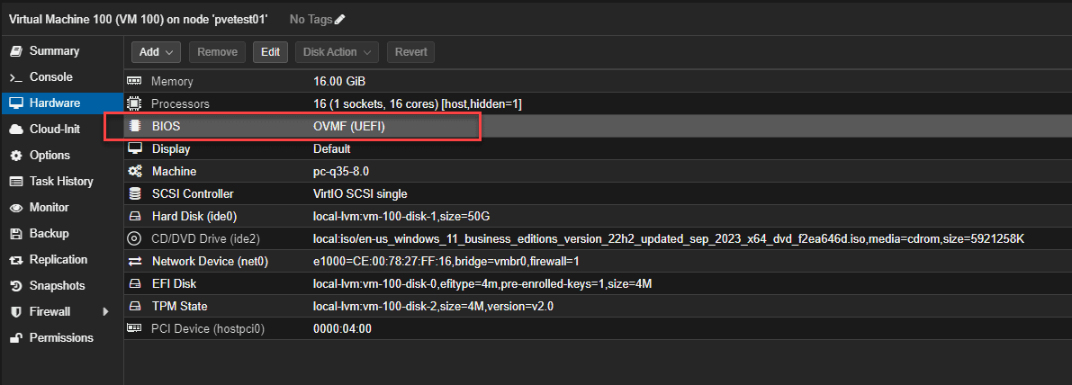 This configuration involves adding the PCI devices (GPU and audio function) to the VM and ensuring that the VM uses the OVMF (UEFI) firmware instead of the traditional BIOS.