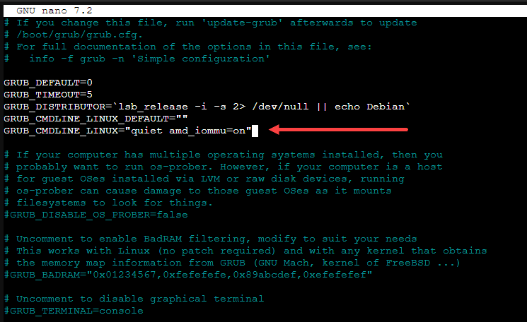 After configuring the necessary files, update the GRUB bootloader to apply the changes. Edit the /etc/default/grub file to add the intel_iommu=on or amd_iommu=on (depending on your CPU) and vfio_pci.ids parameters.
