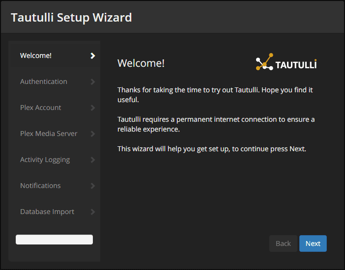 Once you have spun up the Tautulli Docker container, you will navigate to the default port 8181 and you will be greeted with an initial setup wizard. It will guide you through integrating with your Plex environment and configuration settings.