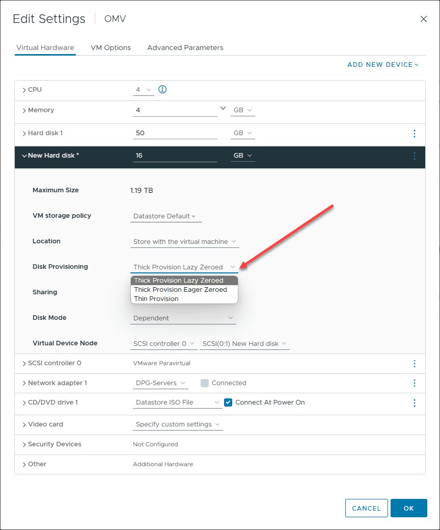 Lazy Zeroed – In contrast, the lazy-zeroed thick disk allocates all the space from the start when it is created but zeroes each block only when written for the first time. This method shortens the creation period but may slightly dip performance on the initial block write. Nonetheless, subsequent write speeds match those of eager-zeroed disks. Notably, the performance during the initial write for lazy-zeroed thick disks saw enhancements beginning with vSphere 7.0 Update 2, although eager-zeroed disks continue to top in initial write performance.