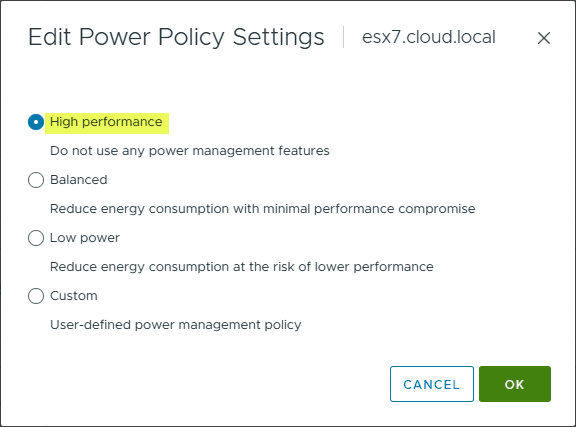 Choose the ‘High performance’ power policy for the ESXi host. This is the recommended approach. You can also switch off power management via the BIOS. It’s important to note that both methods might lead to higher power usage.