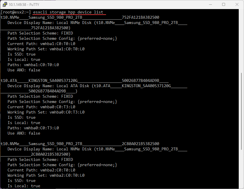 There are a number of esxcli commands that allow interacting with the HPP plugin configuration. Below, we are using the command: