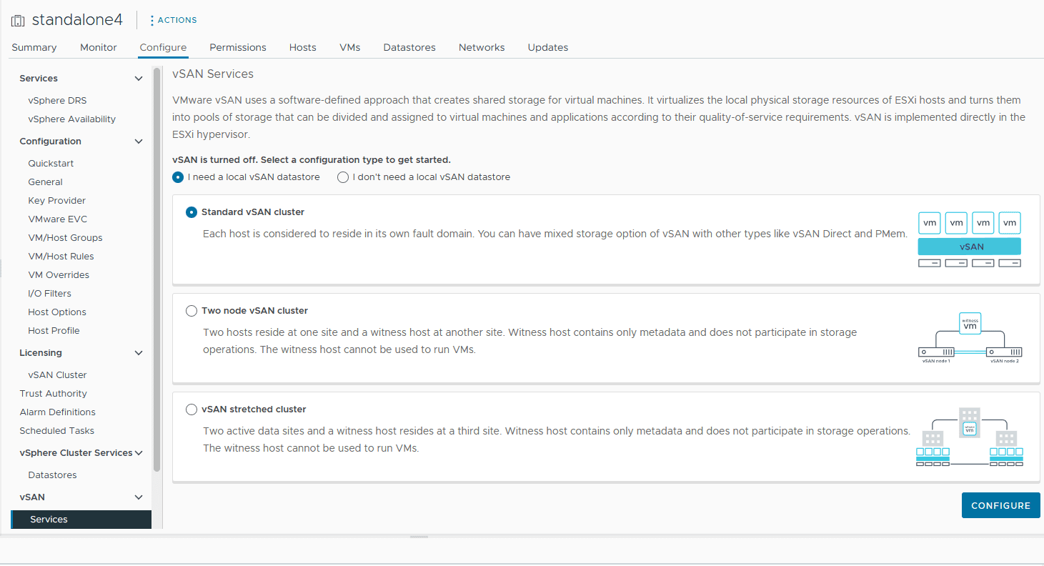 VMware vSAN is a modern hyperconverged storage solution that aggregates local storage from your ESXi hosts into a single storage pool shared between the cluster hosts. When you configure a VM, the virtual disk appears on the vsanDatastore.