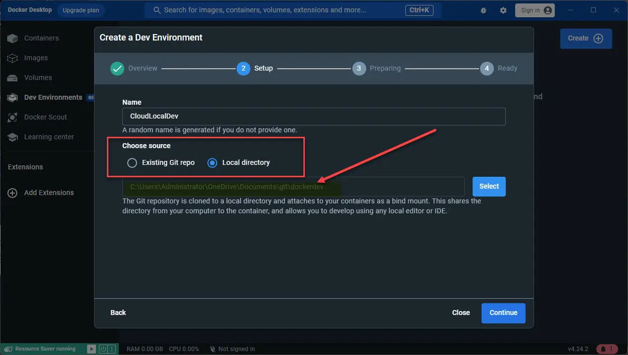 On the Setup screen > Choose source, you can select between Existing Git repo or Local directory. Here I am choosing local directory.