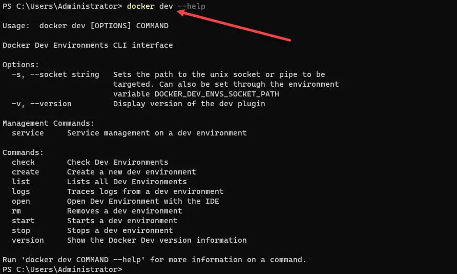You can also launch Docker Dev environments with the docker dev CLI tool. You can see the output of the Docker Dev CLI tool with the following: