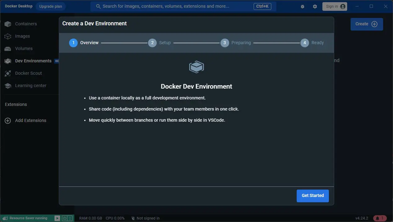 Docker Desktop is a great tool that you can use to have a GUI tool to interact with Docker, especially on Windows machines. One of the features of the Docker Desktop tool is the Dev Environment.