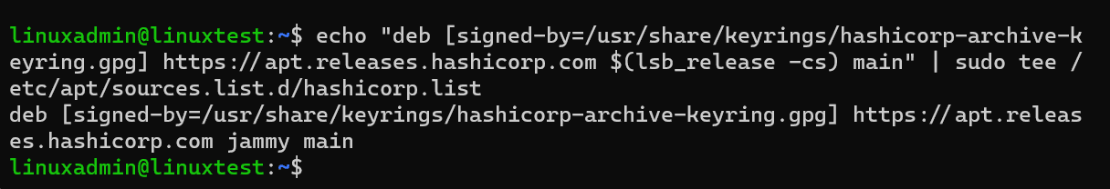 echo "deb [signed-by=/usr/share/keyrings/hashicorp-archive-keyring.gpg] https://apt.releases.hashicorp.com $(lsb_release -cs) main" | sudo tee /etc/apt/sources.list.d/hashicorp.list