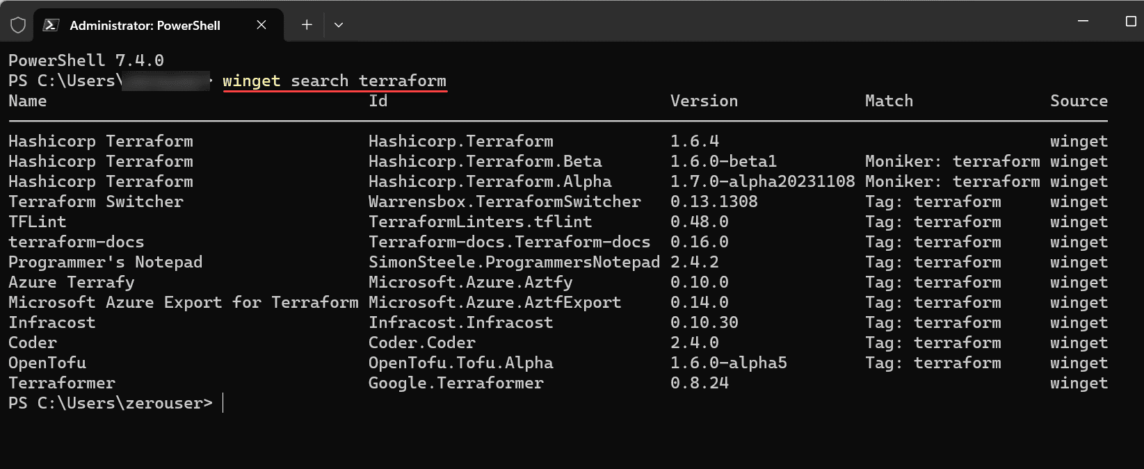 You can see the terraform packages available for installation with winget using the command: