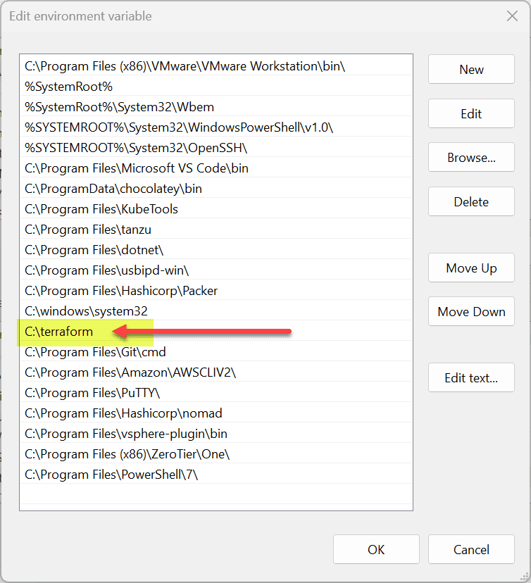 - Add the Terraform directory to your system environment variables to make Terraform commands accessible from the command prompt.