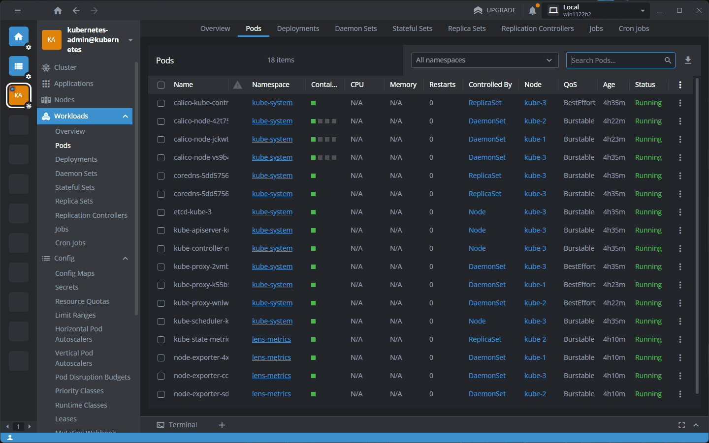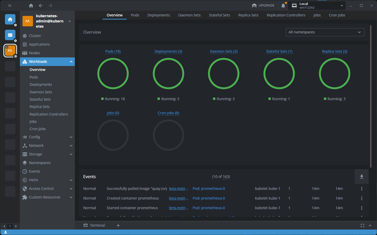 Below are a few screenshots of viewing cluster information from the Kubernetes cluster added to Lens.