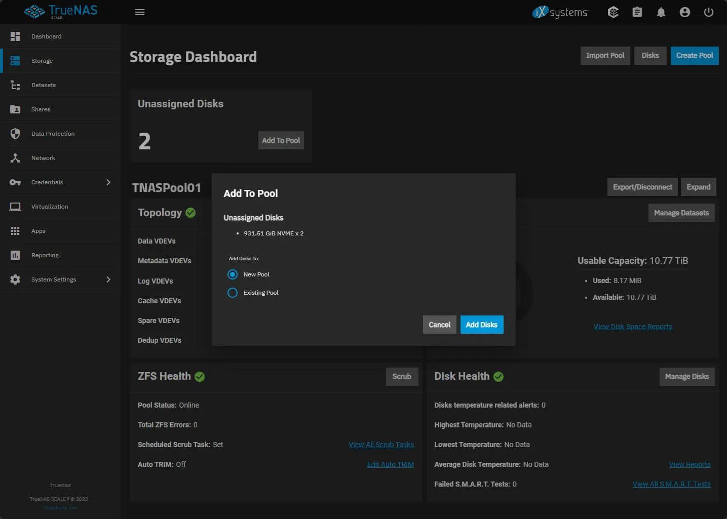 Setting up the NVMe pool below and adding the (2) NVMe disks to the pool.